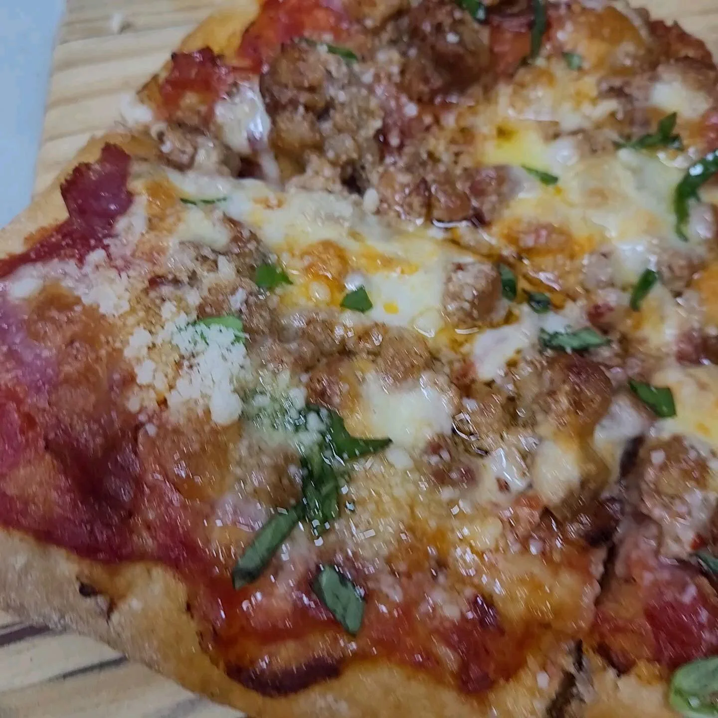 San Marzano Tomatoes, in-house made Italian sausage, spicy sopressata, fennel salame, fior di latte, our cheese blend, basil, EVOO